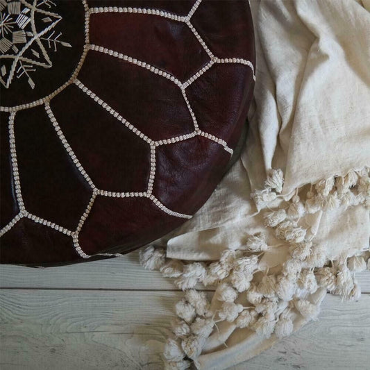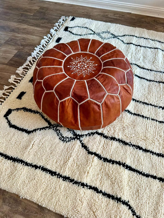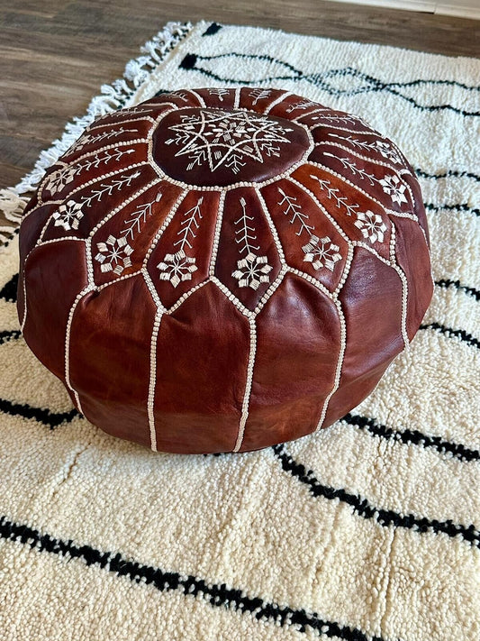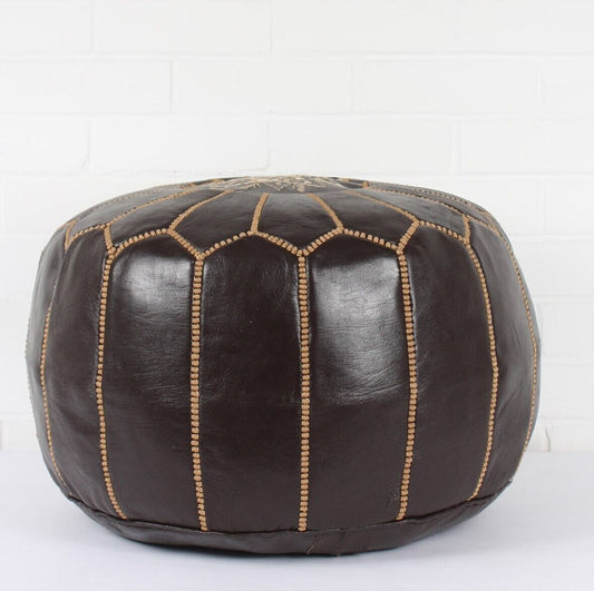 Stunning Moroccan Leather Ottoman (Pouffe) – Dark Tan with Hand-Sewn Intricate Stitch Detailing
