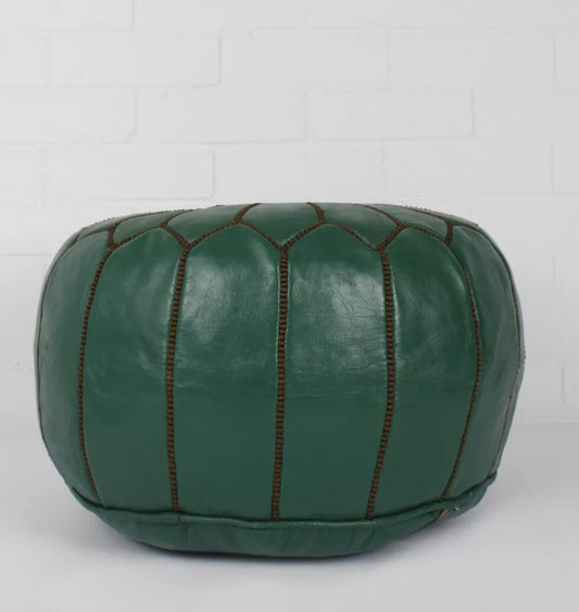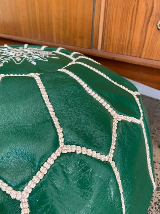 Stunning Moroccan Leather Ottoman (Poufe) GREEN w/White Stitching